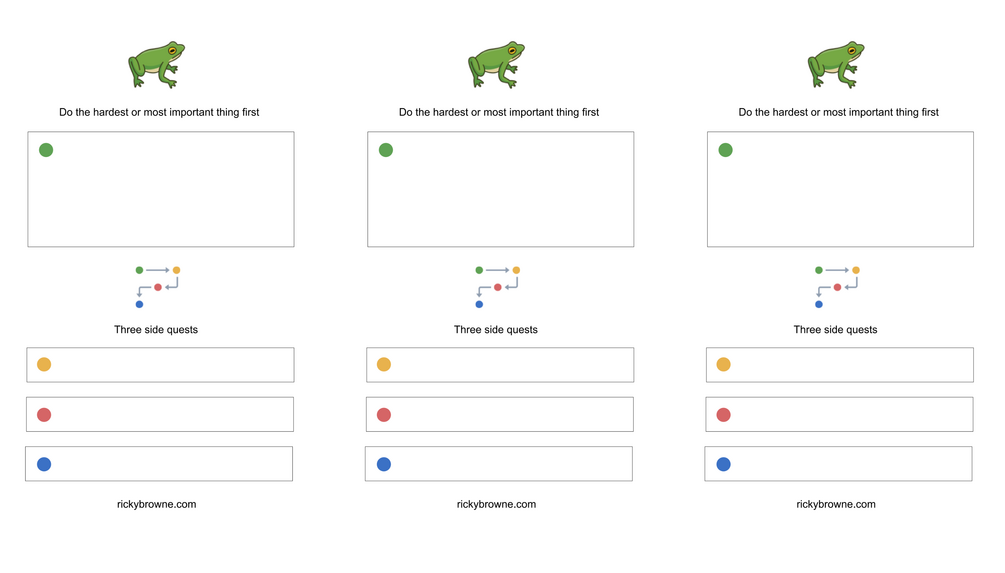 Start each day with clarity and focus. This method helps you prioritize by focusing on one major task—the "Main Quest"—the hardest or most important job that must be done first. It also includes three "Side Quests," tasks you should do or really want to complete once the main quest is done.